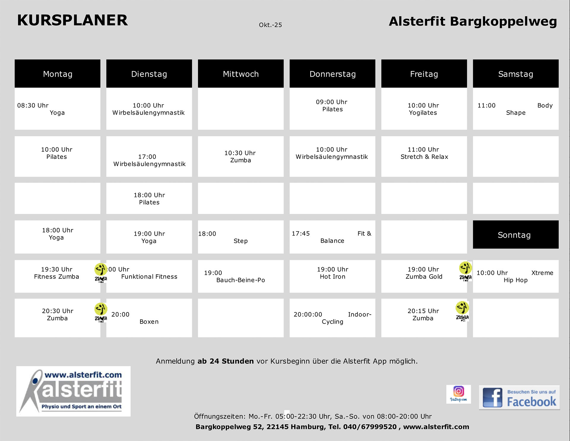 Alle Kurse im Alsterfit Fitnessstudio Rahlstedt »Funktional Fitness« und »Indoor Cycling« können aus organisatorischen Gründen nicht Tage im Voraus gebucht, sondern nur am Kurstag reserviert werden.